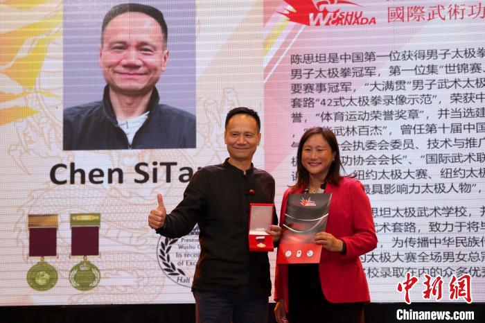 8月7日,加拿大聯(lián)邦眾議員葉嘉麗(右)向來自中國的太極名家陳思坦頒授國際武術功夫名人堂勛章?!≈行律缬浾?余瑞冬 攝