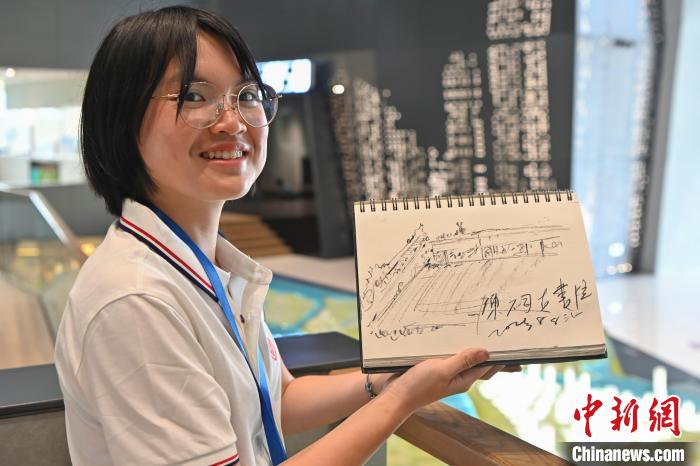 8月8日,2023年全國臺聯(lián)第二十屆臺胞青年千人夏令營廣東分營在廣州開營。圖為一名臺灣青年學生展示自己素描的廣州陳家祠。中新社記者 陳驥旻 攝