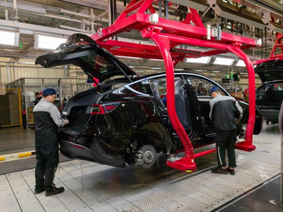 在特斯拉上海超級工廠,工人在車間內(nèi)忙碌(2月27日攝)。新華社記者 周蕊 攝
