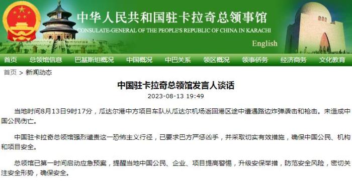 中國駐卡拉奇總領館強烈譴責這一恐怖主義行徑,已要求巴方嚴懲兇手,并采取切實有效措施,確保中國公民、機構(gòu)和項目安全。