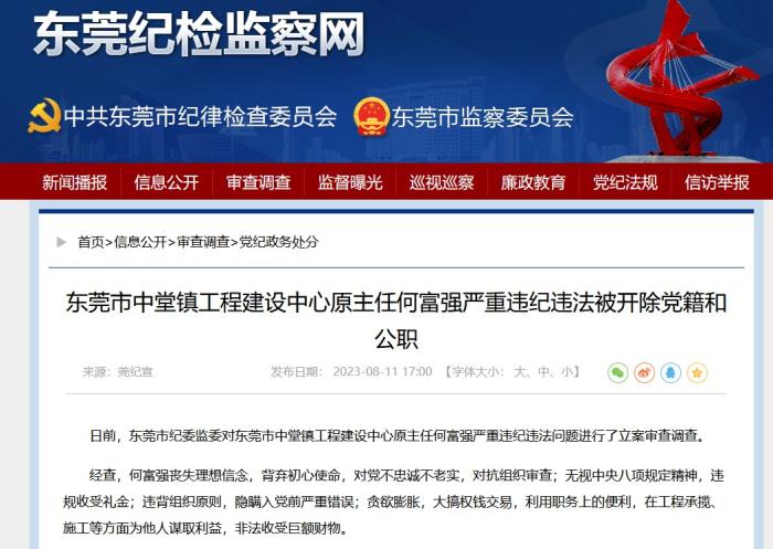 中新網(wǎng)北京8月14日電 近日,廣東東莞市紀委監(jiān)委發(fā)布消息,東莞市中堂鎮(zhèn)工程建設中心原主任何富強被“雙開”。
