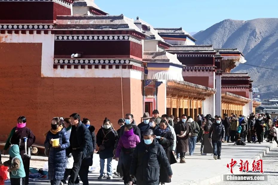2023年2月5日被譽(yù)為“世界藏學(xué)府”的拉卜楞寺迎來(lái)一年中最熱鬧的“朝佛季”,眾多藏傳佛教信眾及游客前來(lái)轉(zhuǎn)經(jīng)、禮佛、朝拜。圖為信眾及游客前往朝佛途中。中新社記者 九美旦增 攝