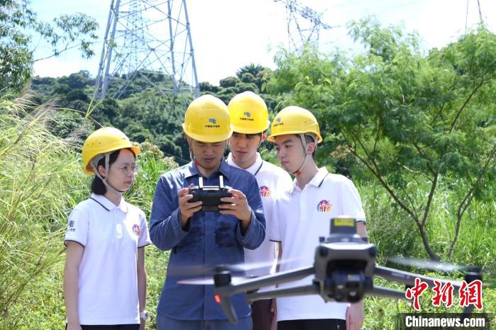 在南方電網(wǎng)公司深圳供電局實習(xí)的港澳臺大學(xué)生學(xué)習(xí)開展無人機巡視作業(yè)。(南方電網(wǎng)供圖)