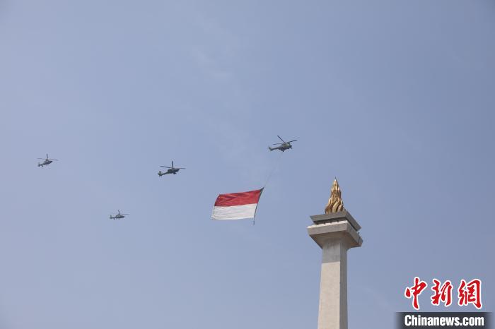 8月17日,雅加達(dá)獨(dú)立廣場(chǎng)上空,直升機(jī)拉起巨幅印尼國(guó)旗。中新社記者 李志全 攝