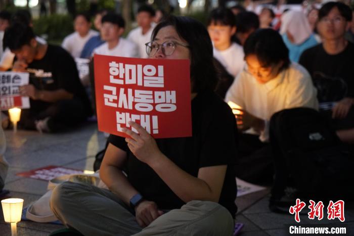 18日晚間,韓國(guó)民間團(tuán)體“停戰(zhàn)70年朝鮮半島和平行動(dòng)”在首爾光化門廣場(chǎng)附近舉行燭光集會(huì),抗議韓美聯(lián)合軍演,反對(duì)韓美日加強(qiáng)軍事合作。