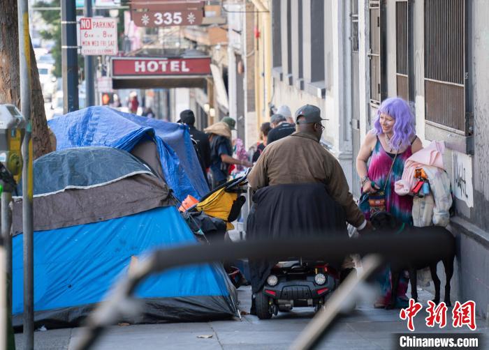 當(dāng)?shù)貢r(shí)間8月18日,無家可歸者從美國(guó)舊金山田德隆區(qū)街頭經(jīng)過。中新社記者 劉關(guān)關(guān) 攝