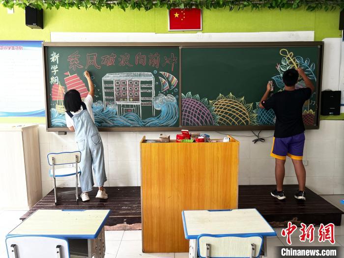 8月18日,夏村中學(xué)教師丁玲和學(xué)生徐俊熙正在繪制迎接新學(xué)期的黑板報(bào)。中新社記者 呂少威 攝