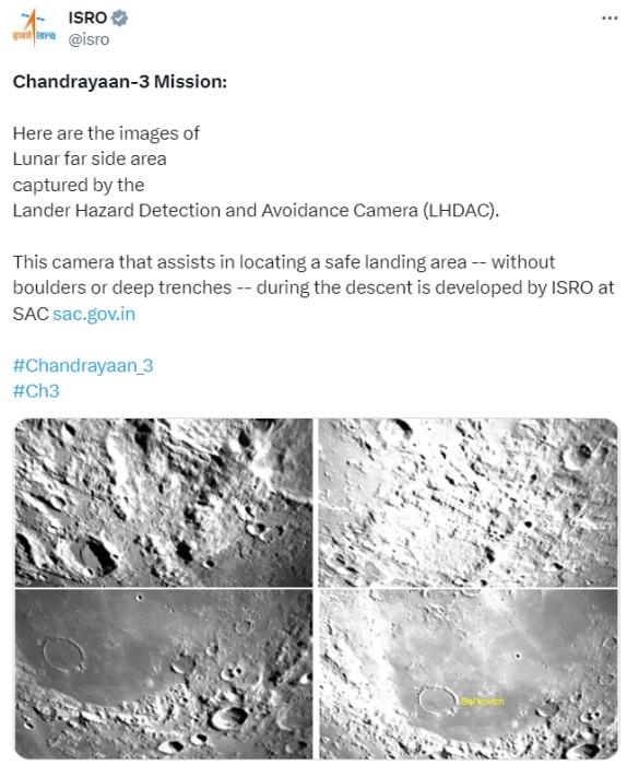 當(dāng)?shù)貢r(shí)間8月21日,ISRO在社交媒體上發(fā)布了“月船3號(hào)”上的LHDAC相機(jī)(著陸器危險(xiǎn)探測(cè)與規(guī)避相機(jī))拍攝的月球表面圖像。圖片來(lái)源:ISRO社交賬號(hào)截圖