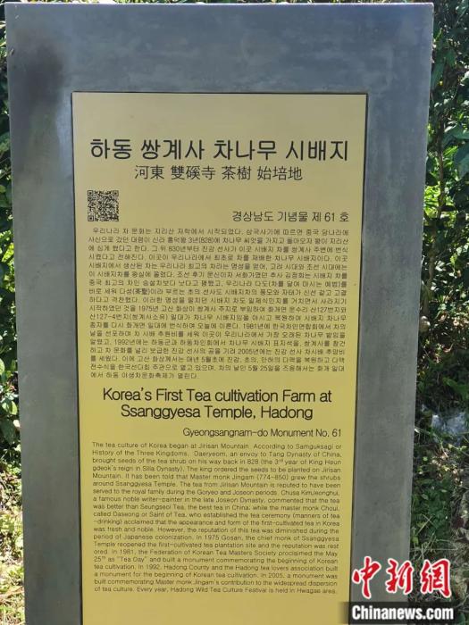 田杰:茶是什么時候、如何傳入韓國的,說法比較多。不過普遍認為韓國茶文化是始于朝鮮半島的三國時期。有“新羅善德女王時期萌芽,興德王時期盛行”的說法。據(jù)記載,新羅興德王3年,也就是公元828年,興德王派使臣“大廉”出使中國。回國的時候大廉帶回了茶種,新羅王將茶種種在了智異山腳下。之后雙溪寺的僧人將其在寺院周圍培植,形成了大片茶園?,F(xiàn)在全羅道河東是韓國綠茶的主要產(chǎn)地之一。在河東雙溪寺附近有韓國茶“始培地”,并有碑刻。
