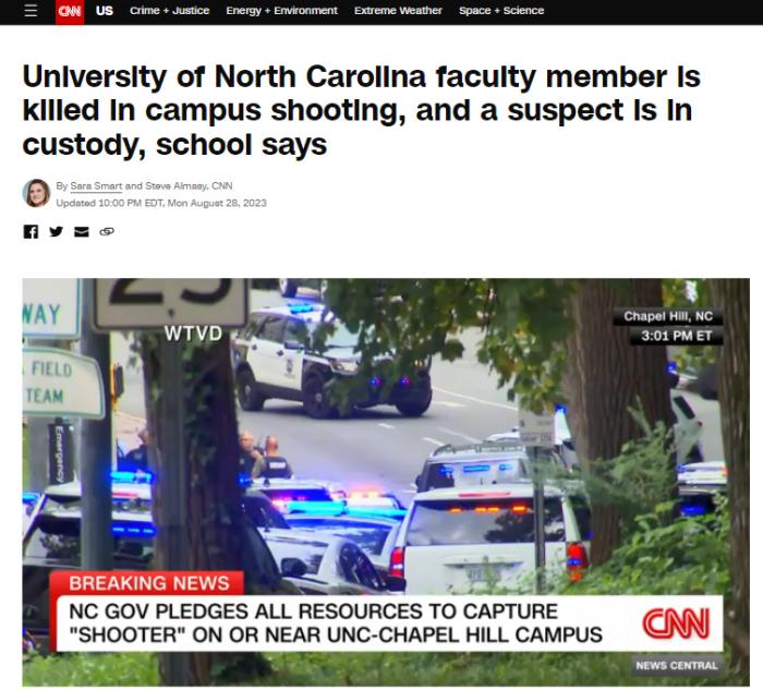 中新網(wǎng)8月29日電 綜合美媒報(bào)道,當(dāng)?shù)貢r(shí)間28日,美國北卡羅來納大學(xué)教堂山分校發(fā)生一起槍擊事件,造成該校一名教職人員死亡。