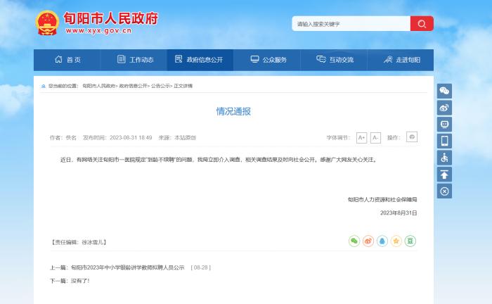 8月31日,據(jù)旬陽市人民政府網(wǎng)站發(fā)布情況通報(bào),旬陽市人力資源和社會保障局已對此介入調(diào)查,相關(guān)調(diào)查結(jié)果及時向社會公開。