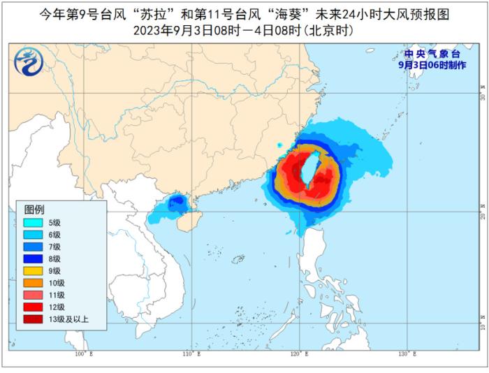 9月3日08時(shí)至4日08時(shí),受“??庇绊懀褪亢{、臺灣海峽、臺灣以東洋面、東海南部及釣魚島附近海域以及浙江南部沿海、福建沿海、臺灣島沿海將有6-8級、陣風(fēng)9-10級大風(fēng),部分海域或地區(qū)的風(fēng)力有9-12級,陣風(fēng)13-14級,“海葵”中心經(jīng)過的附近海面或地區(qū)的風(fēng)力有13-16級,陣風(fēng)17級。