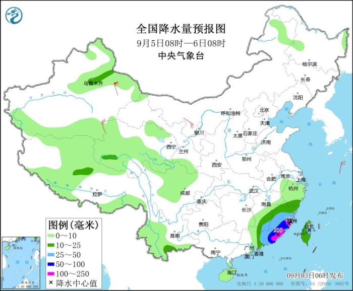 9月5日08時(shí)至6日08時(shí),新疆沿天山地區(qū)、浙江南部、福建大部、江西東南部、廣東中東部、臺灣島等地部分地區(qū)有中到大雨,其中,福建東南部、廣東東部等地部分地區(qū)有暴雨或大暴雨(100~200毫米)。內(nèi)蒙古西北部、青海西部等地部分地區(qū)有4~6級風(fēng),其中,新疆東部部分地區(qū)有8~9級風(fēng)。東海南部、臺灣以東洋面、臺灣海峽、巴士海峽、南海東北部有6~8級大風(fēng)、陣風(fēng)10~11級,其中臺灣以東洋面、臺灣海峽、巴士海峽北部、南海東北部部分海域風(fēng)力可達(dá)9~11級、陣風(fēng)13~14級。