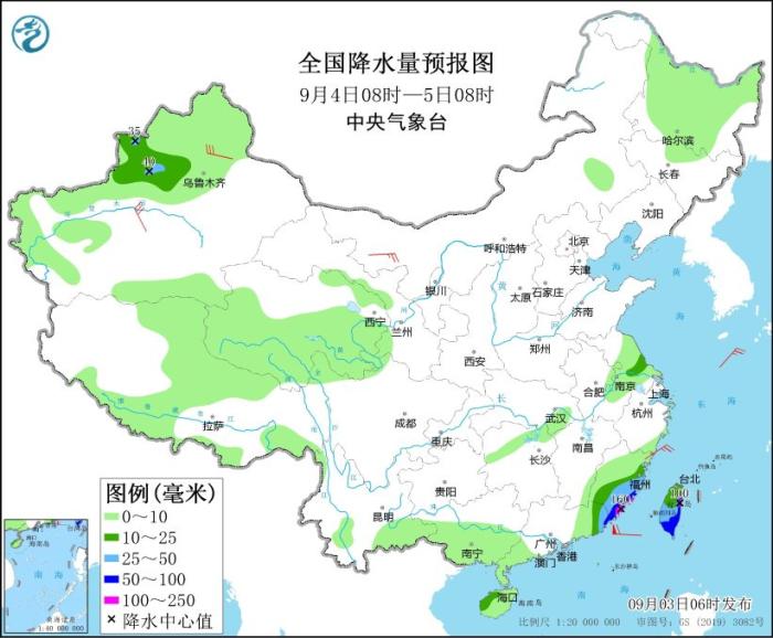 9月4日08時(shí)至5日08時(shí),新疆沿天山地區(qū)和伊犁河谷、福建東南部、廣東東部、海南島西北部、臺灣島等地部分地區(qū)有中到大雨,其中,福建東南部沿海地區(qū)、廣東東南部沿海、臺灣島東部等地部分地區(qū)有暴雨或大暴雨(100~160毫米)。內(nèi)蒙古西北部、新疆南疆盆地、福建東部沿海等地部分地區(qū)有5~7級風(fēng)。東海南部、臺灣以東洋面、臺灣海峽、巴士海峽、南海東北部有6~8級大風(fēng)、陣風(fēng)10~11級,其中臺灣以東洋面、臺灣海峽、巴士海峽北部、南海東北部部分海域風(fēng)力可達(dá)9~11級、陣風(fēng)13~14級。