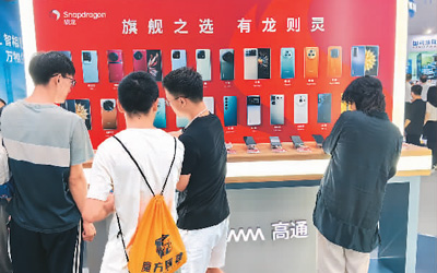 觀眾在高通展區(qū)體驗搭載驍龍移動平臺的智能手機。