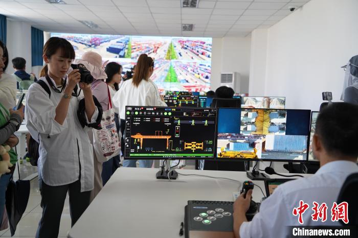 “像抓娃娃一樣”“操作桿仿佛游戲手柄”......看著工作人員在電腦上遠(yuǎn)程操控自動(dòng)化龍門(mén)吊,多位臺(tái)灣媒體人感慨,“黑科技”讓操控?cái)?shù)噸重的集裝箱舉重若輕。