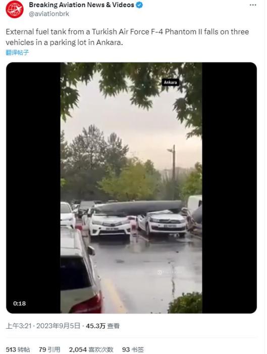 中新網(wǎng)9月6日電 綜合外媒報(bào)道,當(dāng)?shù)貢r(shí)間9月4日,土耳其空軍一架戰(zhàn)斗機(jī)在飛行途中油箱突然掉落,砸中安卡拉市一露天停車場(chǎng)的汽車,所幸未造成人員傷亡。