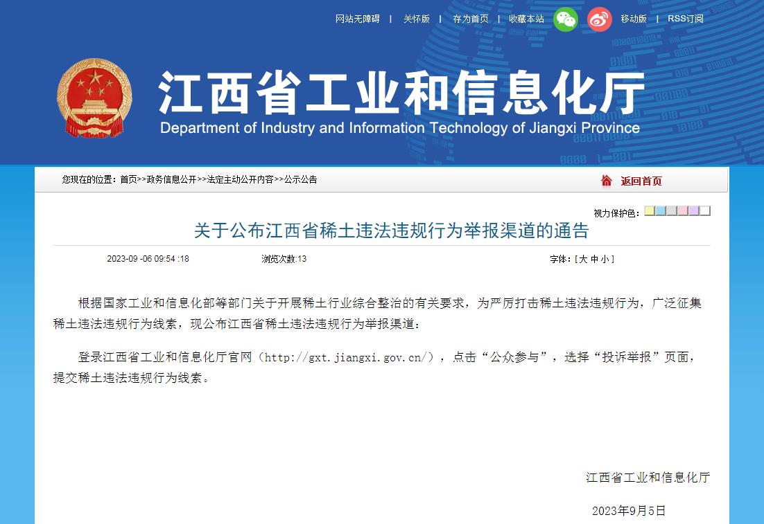 中新網(wǎng)9月6日電 據(jù)江西省工業(yè)和信息化廳官網(wǎng)6日消息,根據(jù)國(guó)家工業(yè)和信息化部等部門(mén)關(guān)于開(kāi)展稀土行業(yè)綜合整治的有關(guān)要求,為嚴(yán)厲打擊稀土違法違規(guī)行為,廣泛征集稀土違法違規(guī)行為線索,現(xiàn)公布江西省稀土違法違規(guī)行為舉報(bào)渠道:登錄江西省工業(yè)和信息化廳官網(wǎng),點(diǎn)擊“公眾參與”,選擇“投訴舉報(bào)”頁(yè)面,提交稀土違法違規(guī)行為線索。