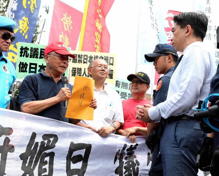 9月6日,臺灣數(shù)十個政黨和團體組成的反“臺獨”反介入聯(lián)合行動在臺北集會,抗議日本將核污染水排入海洋,要求民進(jìn)黨當(dāng)局嚴(yán)禁從日本核污染地區(qū)進(jìn)口食物。圖為臺灣勞動黨主席吳榮元(左二)向民進(jìn)黨當(dāng)局食品安全辦公室官員(右一)遞交抗議信。