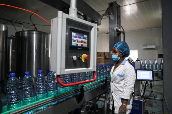 9月9日,當地員工在位于加蓬首都利伯維爾的歐來源純凈水廠生產線上工作。新華社記者韓旭攝