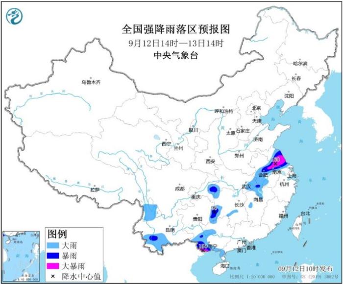 預計,9月12日14時至13日14時,江蘇中部、安徽中部、湖北東南部和西南部、江西北部、湖南西部、貴州東南部、云南西北部和南部、廣西西部和南部等地部分地區(qū)有大到暴雨,其中,江蘇中部、安徽中部偏東地區(qū)、廣西南部等地部分地區(qū)有大暴雨(100~160毫米);上述地區(qū)最大小時降雨量30~50毫米,局地可超過60毫米,局地還有雷暴大風等強對流天氣。