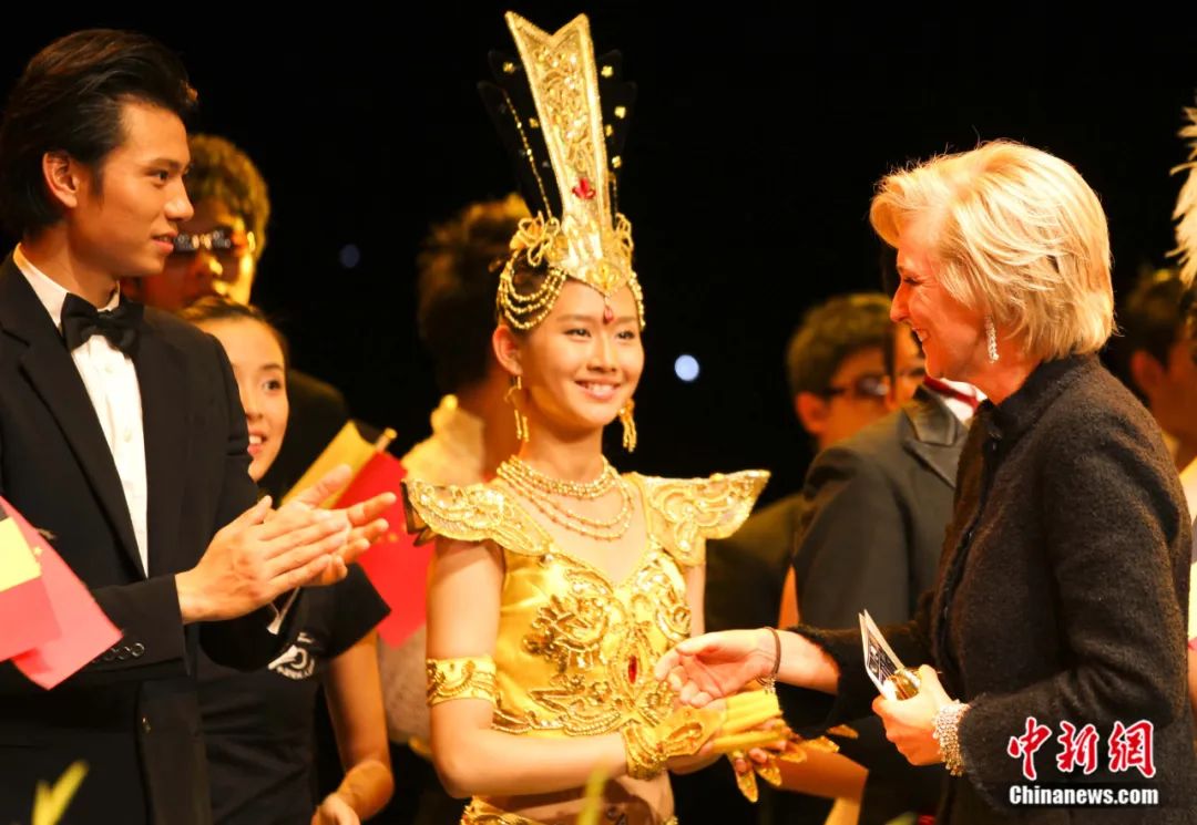 2011年9月,比利時(shí)公主阿斯特里德(右)在布魯塞爾觀看中國(guó)殘疾人藝術(shù)團(tuán)傾情奉獻(xiàn)的演出——《我的夢(mèng)》。圖為阿斯特里德公主向演員致謝。沈晨 攝