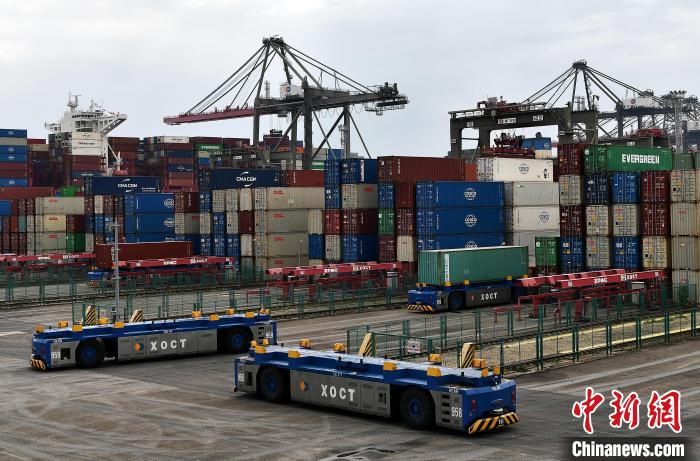 9月7日,廈門遠(yuǎn)海自動化碼頭上,轉(zhuǎn)運(yùn)集裝箱的自動導(dǎo)引車正在作業(yè)。這是全球首個第四代自動化碼頭、中國首個擁有全部自主知識產(chǎn)權(quán)的自動化碼頭,開行了多條“絲路海運(yùn)”命名航線?!≈行律缬浾?張斌 攝