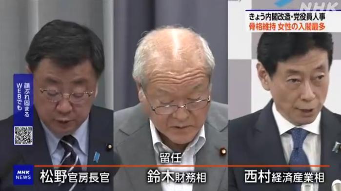 新一屆內(nèi)閣中,日本內(nèi)閣官房長官、財務(wù)大臣和經(jīng)濟(jì)產(chǎn)業(yè)大臣等職位沒有進(jìn)行調(diào)整。圖片來源:日本放送協(xié)會(NHK)報道截圖