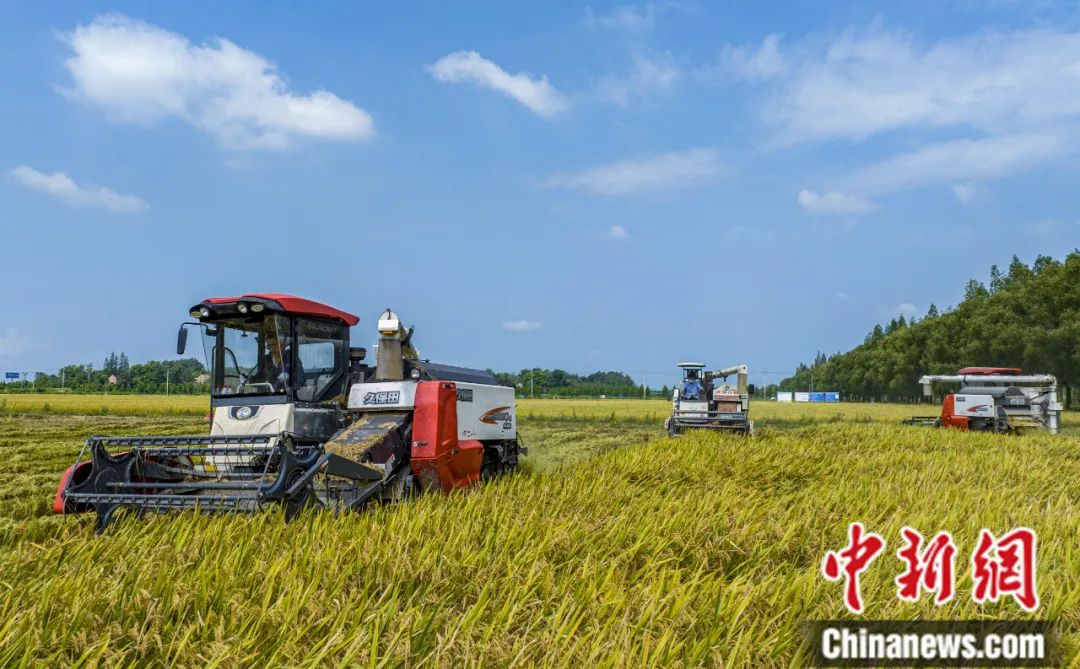 安徽省合肥市廬江縣廣寒村河廣家庭農(nóng)場(chǎng),農(nóng)機(jī)手操作農(nóng)機(jī)在大田里收割早稻。左學(xué)長(zhǎng) 攝