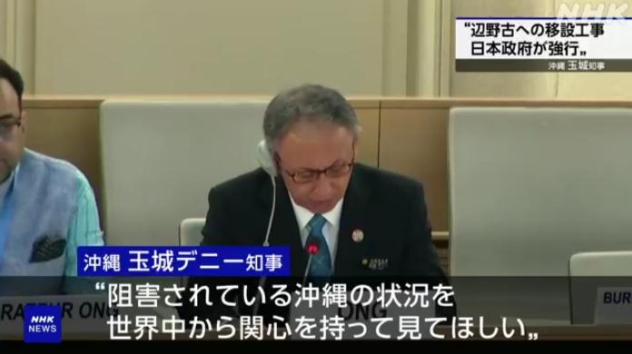 當?shù)貢r間18日,日本沖繩縣知事玉城丹尼在瑞士日內(nèi)瓦召開的聯(lián)合國人權(quán)理事會上,抨擊美日政府不顧沖繩民眾民意強行推進美軍基地搬遷。圖片來源:日本放送協(xié)會(NHK)視頻截圖