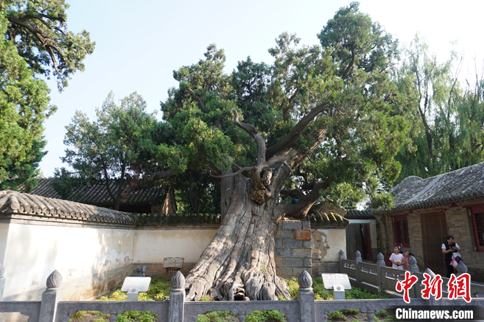 8月7日,河南登封,游客參觀嵩陽書院內(nèi)4500年樹齡的古柏。 中新社記者 韓章云 攝