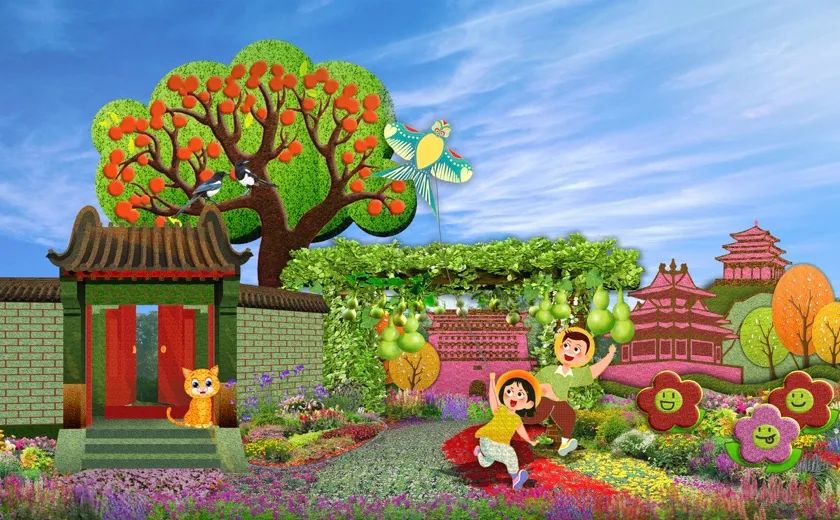 4. 東單西北角的“和諧共生”花壇頂高8.5米,以“三北工程”綠色長城為主景,配以野馬(西北)、麋鹿(華北)、白鶴(東北)、胡楊等典型物種,體現(xiàn)了生態(tài)治理的典范,寓意堅定不移走好人與自然和諧共生的中國式現(xiàn)代化之路。