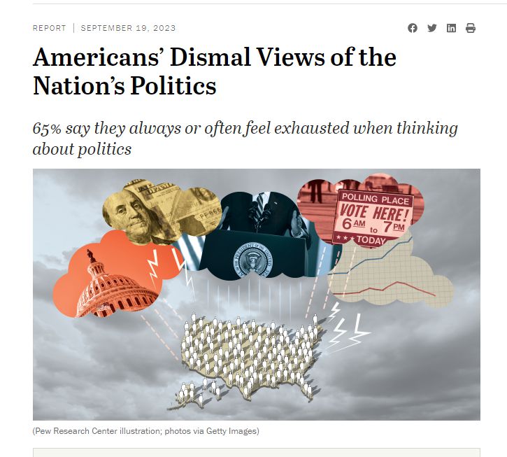 中國(guó)日?qǐng)?bào)網(wǎng)9月20日電(黨超峰)當(dāng)?shù)貢r(shí)間19日,皮尤研究中心公布了一項(xiàng)關(guān)于美國(guó)人對(duì)政治制度現(xiàn)狀看法的新研究。調(diào)查發(fā)現(xiàn),多數(shù)美國(guó)人對(duì)政治制度和民選官員的看法十分消極,幾乎沒(méi)有改善的希望。他們表示政治進(jìn)程被特殊利益集團(tuán)主導(dǎo),充斥著競(jìng)選資金,陷入黨派之爭(zhēng)。民選官員自私自利,效率低下。