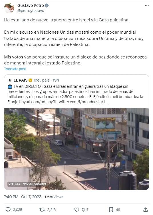 “以色列和巴勒斯坦在加沙地帶再次爆發(fā)戰(zhàn)爭。在聯(lián)合國的演講中,我曾展示了世界大國如何以一種方式對待俄羅斯對烏克蘭的占領(lǐng),但又以另一種截然不同的方式對待以色列對巴勒斯坦的占領(lǐng)。 ”佩特羅在社交媒體X發(fā)文說,“我支持建立和平對話,巴勒斯坦國將得到全面承認。”