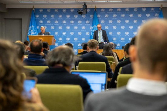 10月9日,在位于紐約的聯(lián)合國總部,聯(lián)合國秘書長古特雷斯(后左)在記者會(huì)上就巴以局勢(shì)發(fā)表談話。新華社發(fā)(聯(lián)合國供圖/保羅·菲爾蓋拉斯攝)