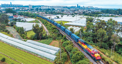 “滬滇·瀾湄線”國際貨運(yùn)班列開行首發(fā)儀式近日在云南省昆明市王家營(yíng)西集裝箱中心站舉行。滿載來自東南亞地區(qū)的水果、橡膠和白糖、金屬硅等產(chǎn)品的班列,駛向上海臨港新片區(qū)蘆潮港站。圖為“滬滇·瀾湄線”國際貨運(yùn)班列駛出王家營(yíng)西集裝箱中心站。
