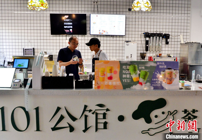 圖為9月19日,曾冠穎(左)在“101公館”內的新式茶飲店鋪和店員交流飲品制作。 中新社記者 張斌 攝