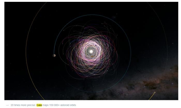 “蓋亞”團(tuán)隊(duì)繪制出的150000多顆小行星的軌道。圖片來(lái)源:歐洲航天局官網(wǎng)