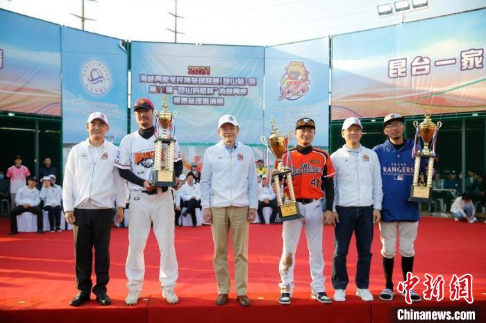“昆山媽祖杯”海峽兩岸慢速壘球邀請賽已成為昆山的代表性體育賽事。圖為2021年10月24日,嘉賓在閉幕式上為獲得競技組前三名的球隊(duì)頒獎(jiǎng)并合影。中新社記者 王駿 攝