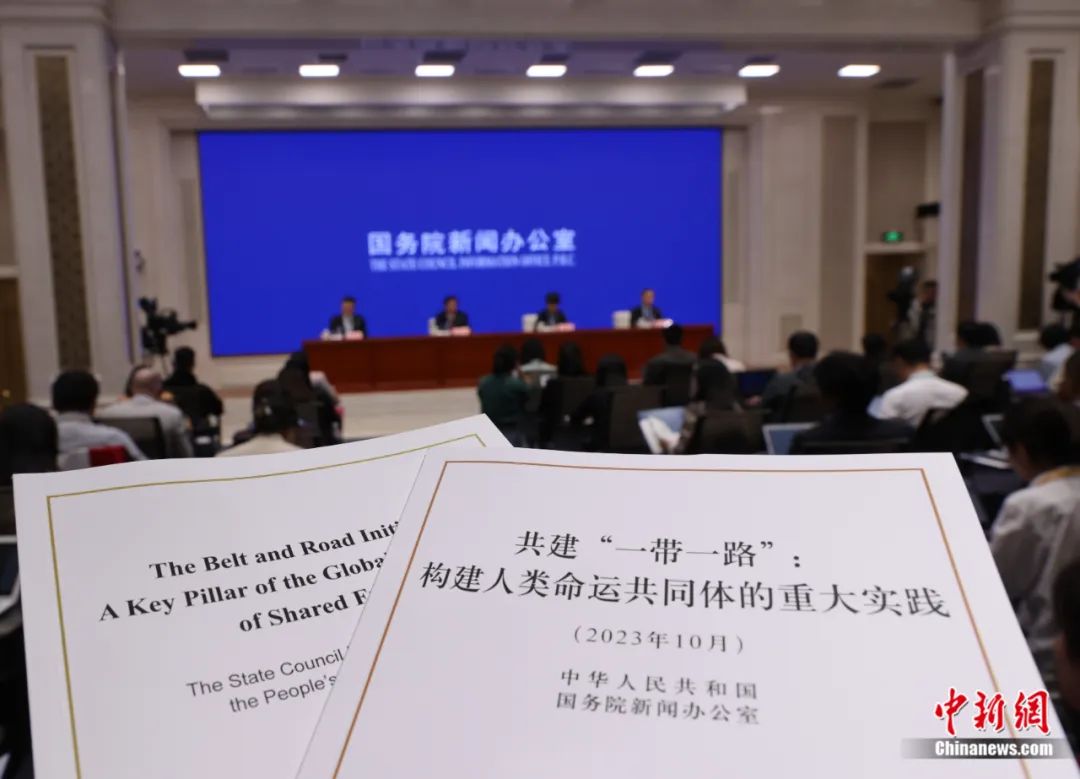 2023年10月10日,中國(guó)國(guó)務(wù)院新聞辦公室在北京舉行新聞發(fā)布會(huì),發(fā)布《共建“一帶一路”:構(gòu)建人類命運(yùn)共同體的重大實(shí)踐》白皮書(shū)。楊可佳 攝