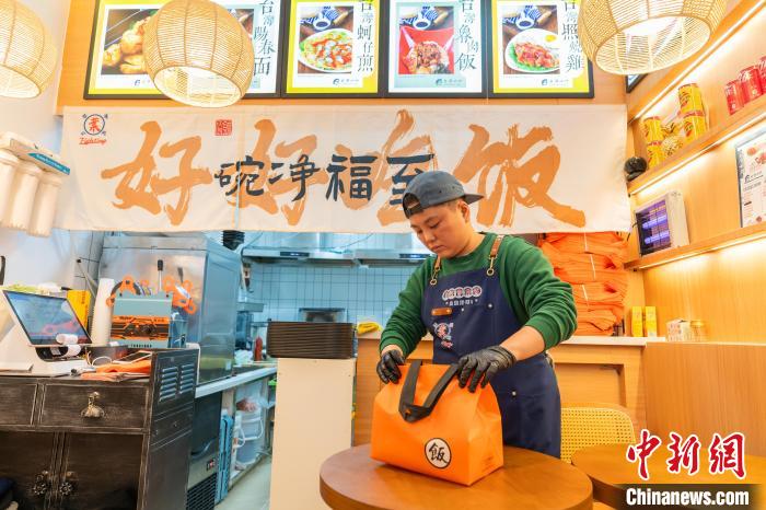 10月22日,臺(tái)灣餐飲人葉韋廷在重慶店內(nèi)將美食打包。 中新社記者 鐘旖 攝