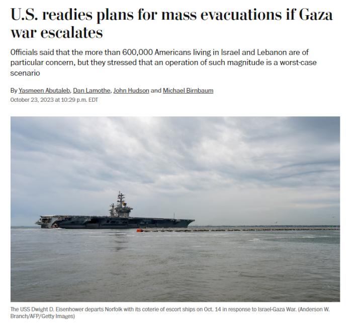 報道還稱,根據(jù)美國政府可能展開的撤離公民行動的規(guī)模,這場行動可能比以往的任何撤離公民行動都更加困難。此次行動可能涉及10月已經(jīng)“涌入”中東地區(qū)的美國空軍飛機和海軍艦艇。