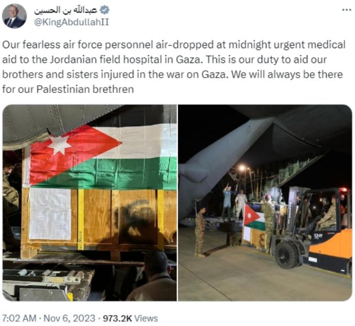 中新網(wǎng)11月6日電 當?shù)貢r間6日,約旦國王阿卜杜拉二世在社交媒體發(fā)文稱,約旦空軍在6日午夜時分向加沙的約旦野戰(zhàn)醫(yī)院空投了緊急醫(yī)療援助物資。
