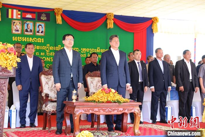 中國駐柬埔寨大使王文天、柬公共工程與運輸部大臣賓波尼及超2000名企業(yè)代表和當(dāng)?shù)孛癖妳⒓討c典活動。