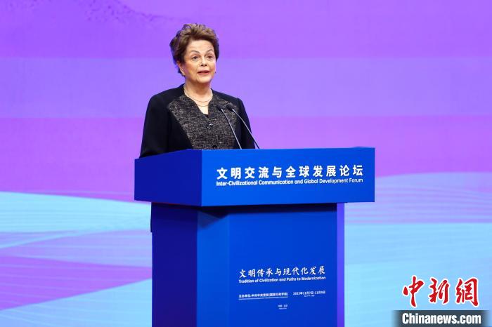 11月7日,由中共中央黨校(國家行政學(xué)院)主辦的文明交流與全球發(fā)展論壇在京開幕。圖為新開發(fā)銀行行長羅塞夫作主旨演講。中新社富田 攝
