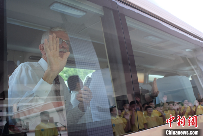 圖為臨別時(shí),代表團(tuán)成員與學(xué)生揮手告別。 中新社記者 劉俊聰 攝