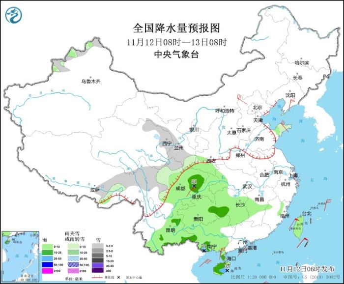 11月12日08時(shí)至13日08時(shí),新疆北疆北部和伊犁河谷、西藏東部、青海南部和東部、川西高原北部、甘肅中南部等地部分地區(qū)有小雪或雨夾雪。四川盆地、貴州東部、湖南西部、云南南部和東部、廣西南部、雷州半島、海南島等地部分地區(qū)有中到大雨,其中,廣西南部、海南島東部局地有暴雨(50~75毫米)。內(nèi)蒙古中東部、遼東半島、河北北部、山東半島、四川盆地、浙江東部、雷州半島等地部分地區(qū)有5~6級(jí)風(fēng)。東海大部、臺(tái)灣海峽、臺(tái)灣以東洋面、巴士海峽、南海北部和中部、北部灣將有7~8級(jí)、陣風(fēng)9級(jí)的大風(fēng)。