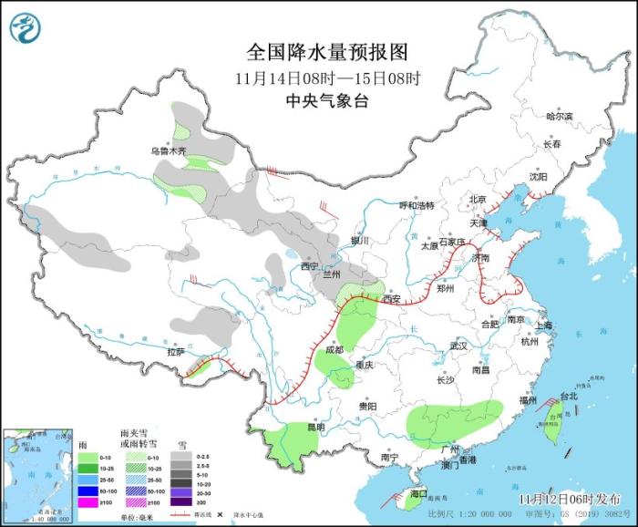 11月14日08時(shí)至15日08時(shí),新疆沿天山地區(qū)和南疆西南部、西藏北部和東部、青海北部和東部、甘肅大部、寧夏南部等地部分地區(qū)有小雪或雨夾雪。甘肅南部、陜西南部、湖南南部、江西南部、福建西南部、四川盆地、云南中部和西南部、廣西東部、廣東中北部、海南島東部、臺(tái)灣島等地部分地區(qū)有小雨。內(nèi)蒙古西北部、青海西部等地部分地區(qū)有5~7級(jí)風(fēng)。臺(tái)灣海峽、北部灣、瓊州海峽將有7~8級(jí)、陣風(fēng)9級(jí)的大風(fēng)。