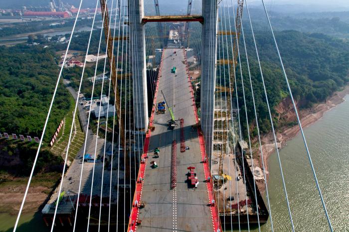 斜拉和懸索組合,強強聯(lián)合,牢固度加倍。大橋采用的這種構(gòu)建形態(tài),有效減少了江中橋墩對航運的影響。中鐵大橋局項目部黨工委副書記張馳對中新網(wǎng)記者介紹,這種設(shè)計的優(yōu)點是跨度大、剛性強、成本低,未來將被廣泛采納和使用。