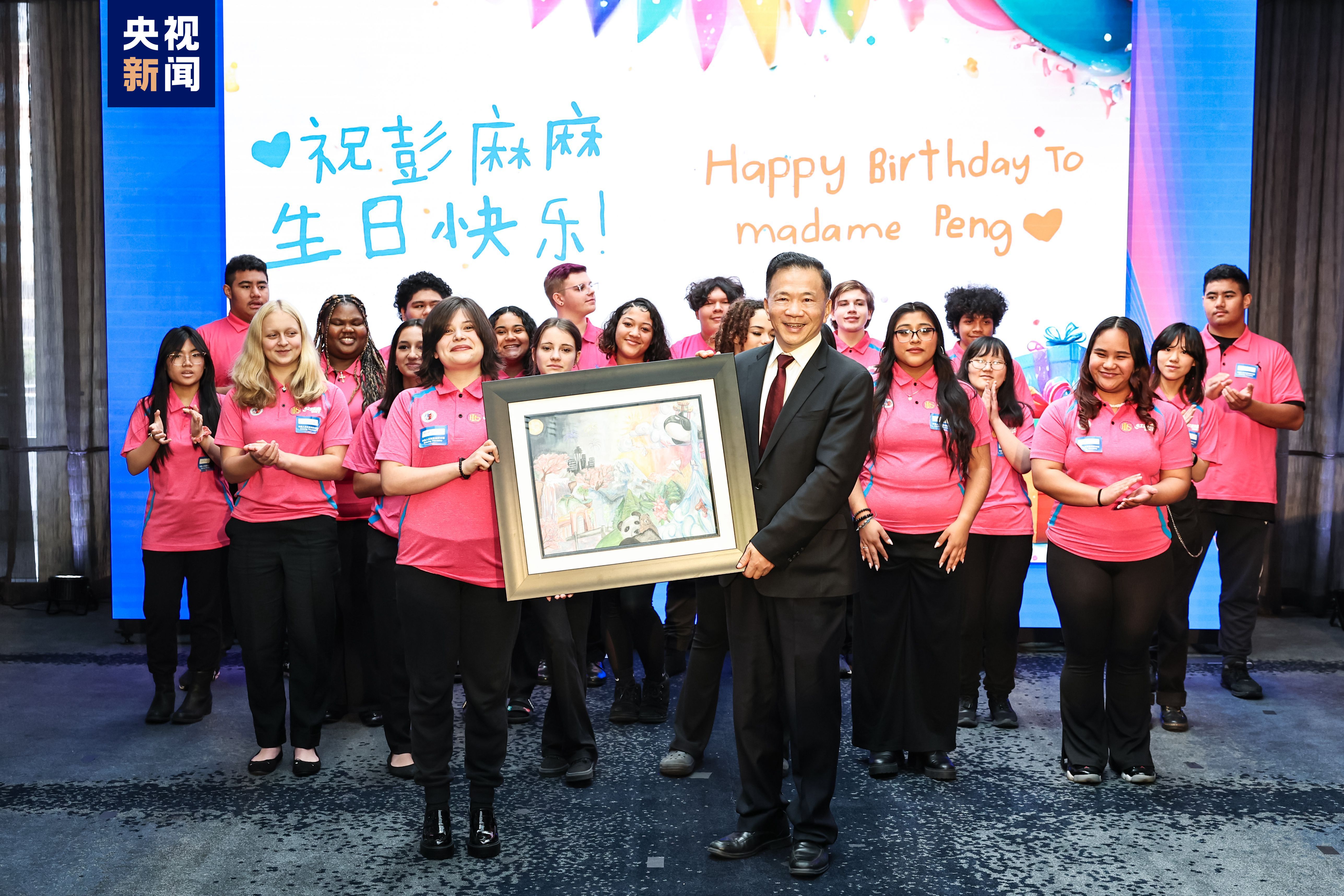 活動現(xiàn)場,來自華盛頓州林肯中學(xué)的合唱團(tuán)演唱了中文歌曲《在希望的田野上》和英文歌曲《伴我同行》,祝愿中美友誼的紐帶更加牢固,煥發(fā)新的活力。同學(xué)們還為習(xí)近平主席和夫人彭麗媛精心準(zhǔn)備了手繪畫作《一起向未來》,并用精美的生日賀卡和《生日快樂》歌親切地為“彭麻麻”送上了生日祝福??偱_臺長代為接收。